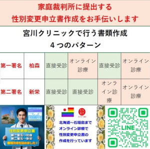 性別変更申立書の作成は、第一署名→柏森、第二署名→新栄で完成させることが出来ます。直接受診でも、オンライン診療でもOK。両者を組み合わせて、4つのパターンで書類を作成することができます。