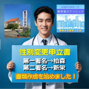 性別変更申立書の作成は、第一署名→柏森、第二署名→新栄で完成させることが出来ます。直接受診でも、オンライン診療でもOK。両者を組み合わせて、4つのパターンで書類を作成することができます。